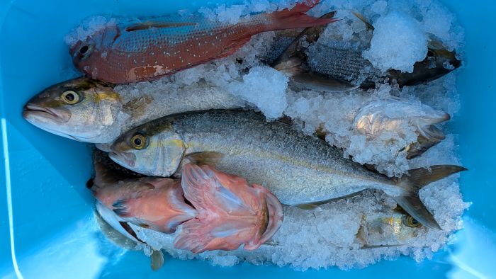 3名様(クーラーの中に、小鯛・3キロのハマチ)