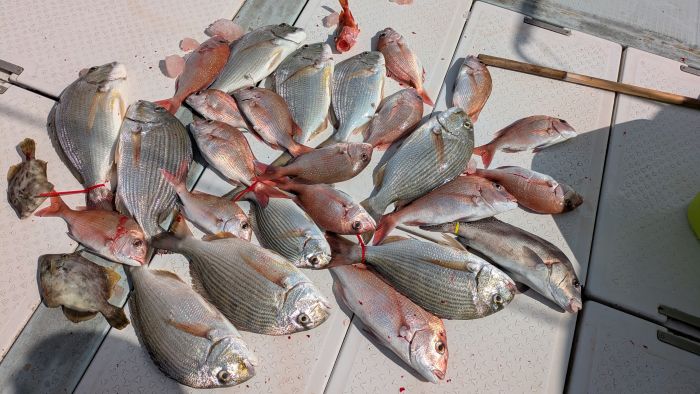 (クーラーに、ネリゴと1キロクラスの真鯛)