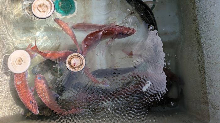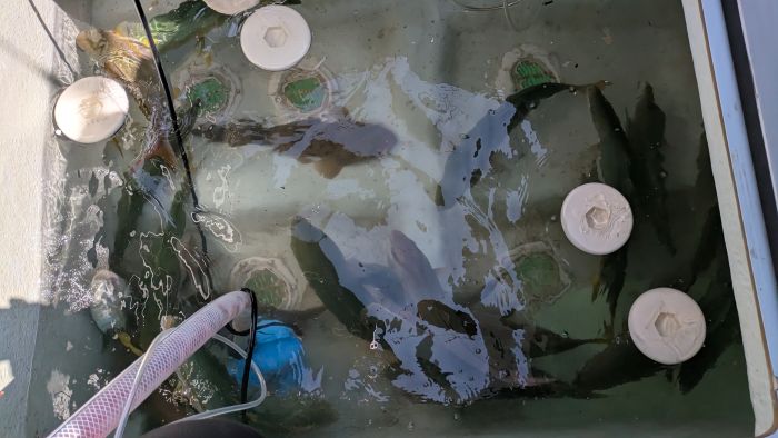 次男の釣果 (水槽に真鯛3.5〜1.5キロが6枚)