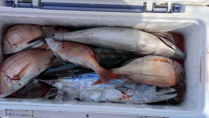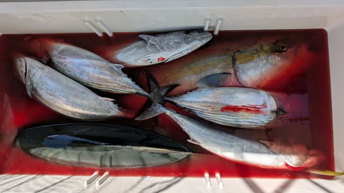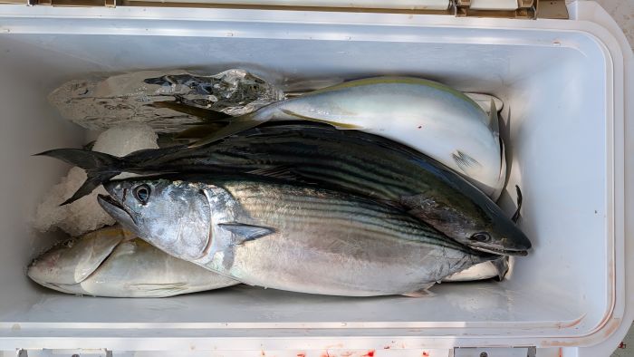次男の釣果(クーラーに、ハガツオ5本、3キロぶり4本)