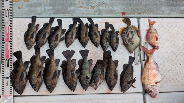 カワハギ10枚とアコウ40センチ、ガラカブ